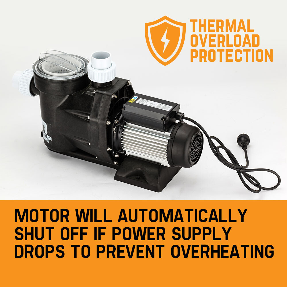 The Protege 1500W Electric Swimming Pool Pump takes care of cleaning, filtration and chlorine/salt distribution. It features a revolutionised removable strainer basket with a built-in thermal overload protection - as the water circulates and passes through the filter, it leaves your pool squeaky clean, free from leaves, hair strands, debris and other impurities.