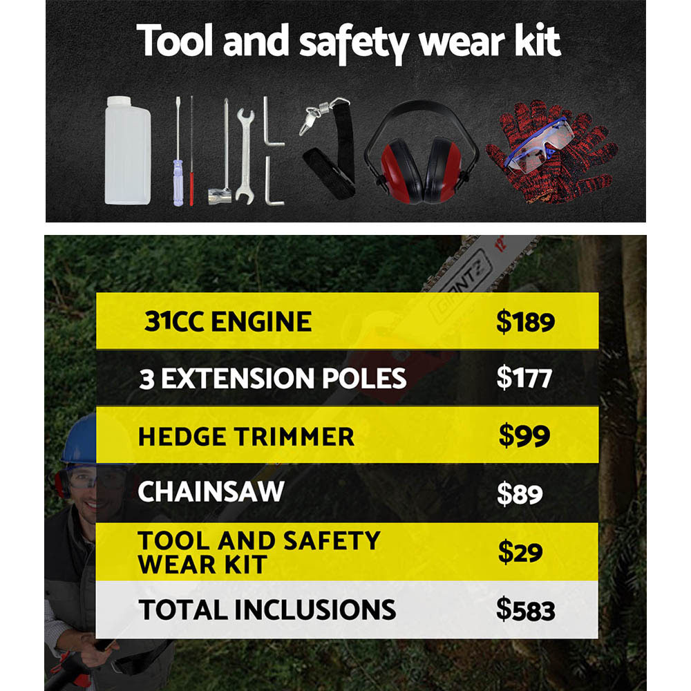 The GIANTZ 31CC 4 Stroke 2 IN 1 Powerful Gardening Tool is the answer for people who are looking for doing some cutting to perfectise the garden and bring it to the next level. Featuring a powerful 31CC 4 Stroke engine with an E-start recoil pull system, you can start trimming the branches professionally in seconds. Efficient and lightweight design equipped with a comfortable and convenient D-handle and quick connect coupling for easy change of attachments, the GIANTZ 31CC 4 Stroke 2 IN 1 Powerful Gardening Tool is designed to make difficult tasks easy. The pole chainsaw comes with 3 extra thick alloy extension poles which allows you to reach up to 6.3 metres for those hard-to-get branches! Flexible gear joint allows blades to adjust in a range of up to 90?. The GIANTZ 2 IN 1 Powerful Gardening Tool will make any gardening work simple, easy and effortless.