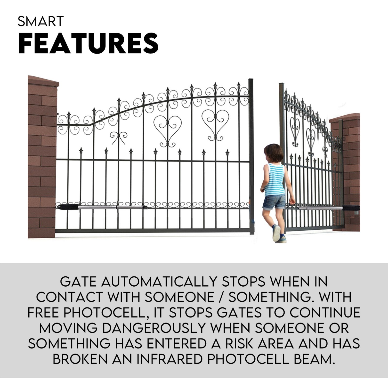Its “auto-close” function with adjustable closing time delay ultimately secures the property after you leave while stops in case of obstruction during gate opening, and reverse in case of obstruction during gate closing. The Gate Opener can be configured to allow smooth noiseless operation and can be configured to enable open or close condition as default.