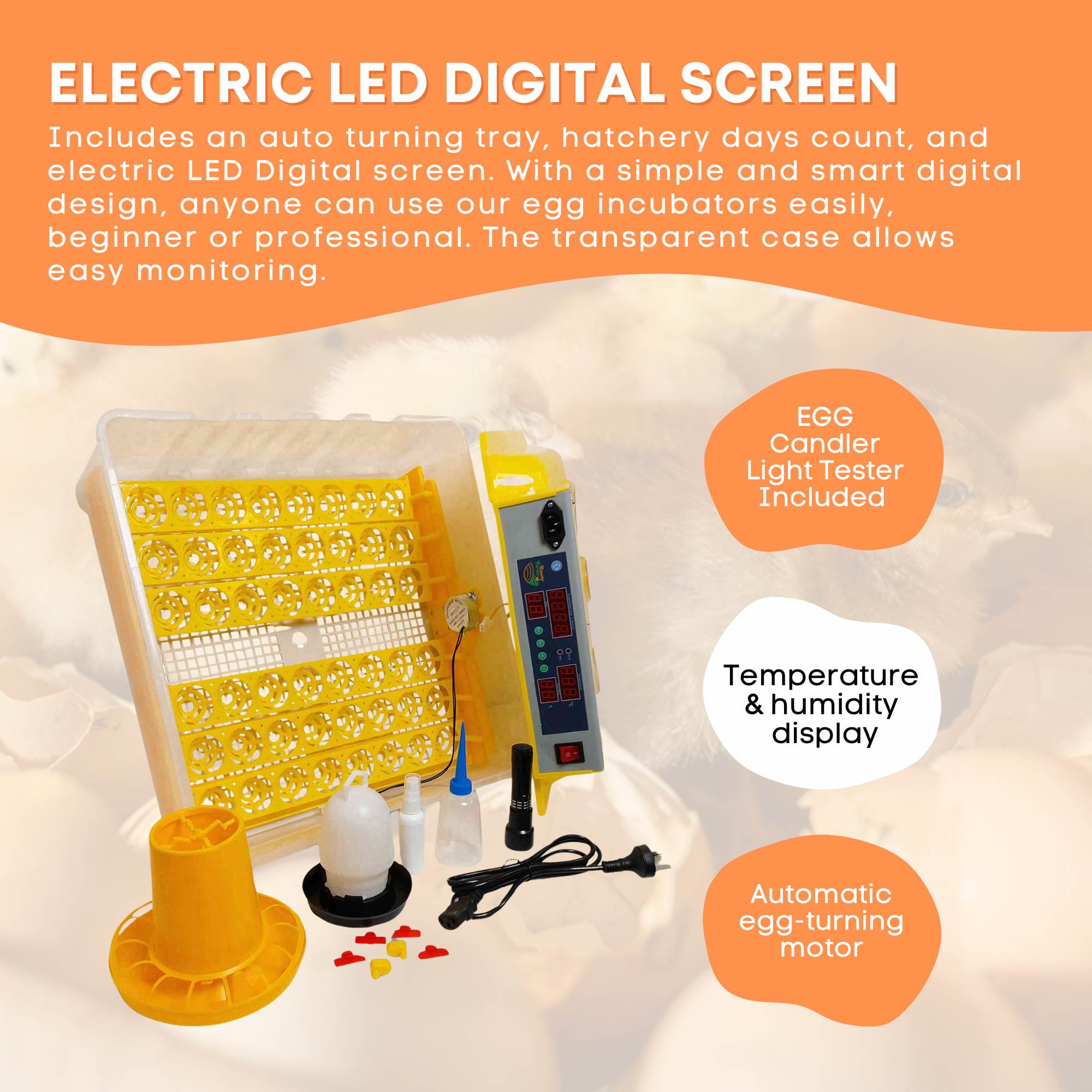 Includes an auto turning tray, hatchery days count, and electric LED Digital screen. With a simple and smart digital design, anyone can use our egg incubators easily, beginner or professional. The transparent case allows easy monitoring.