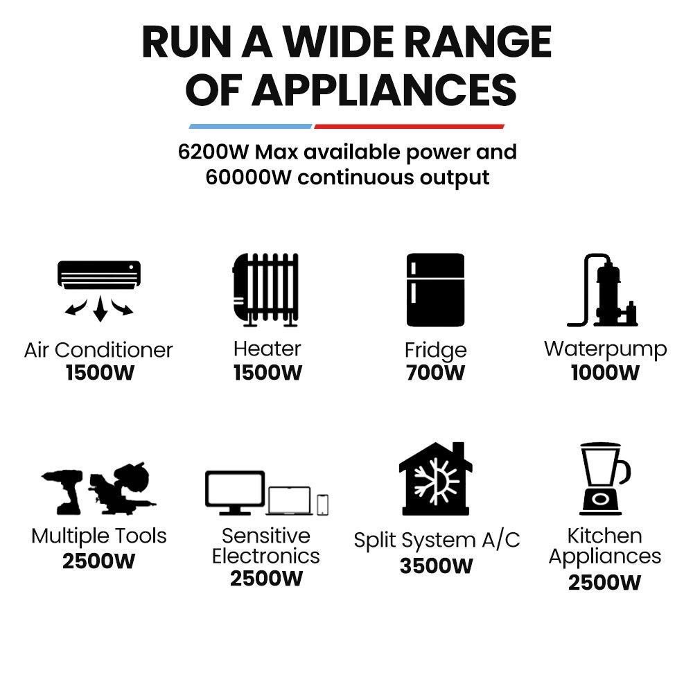- 6200W peak / 6000W continuous for home, leisure, or work
