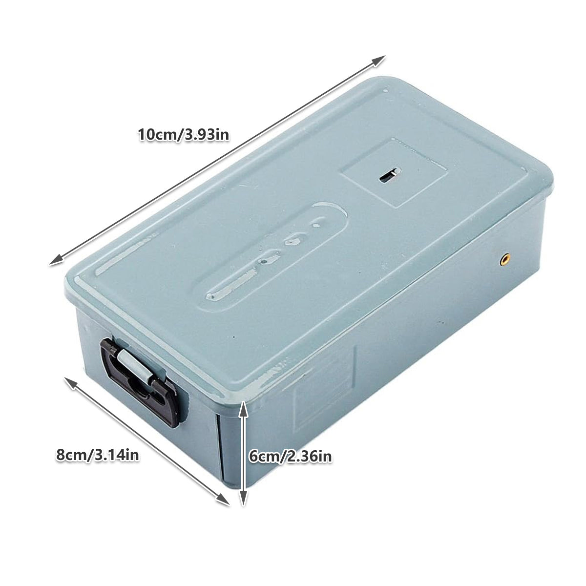 Compact Metal Case: Sturdy iron box for secure storage and quick size identification.