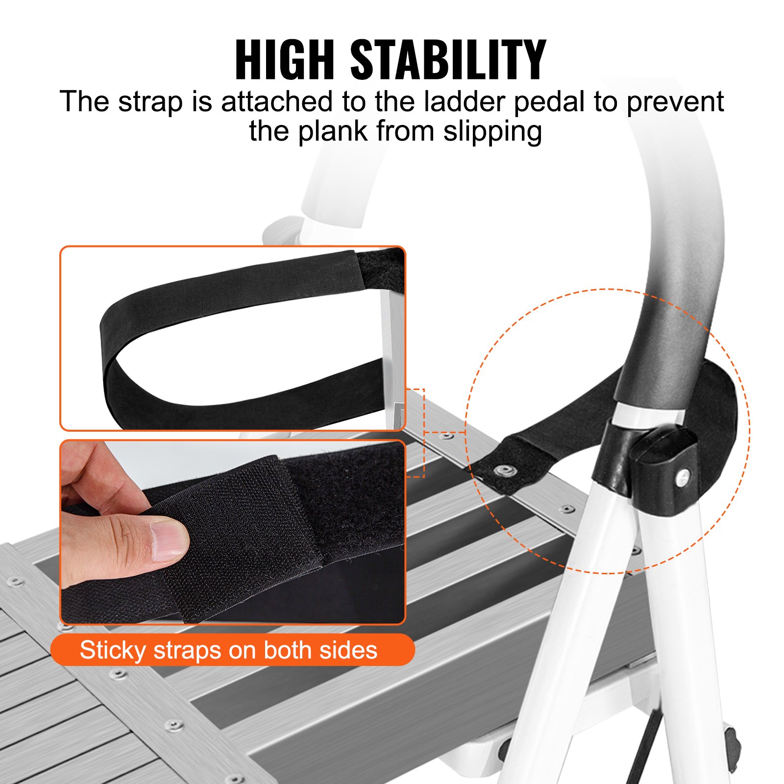 We are always concerned about your security. So the aluminum plank features a sticky strap to avoid slipping off the ladder. And a non-slip surface to increase friction to avoid accidents.
