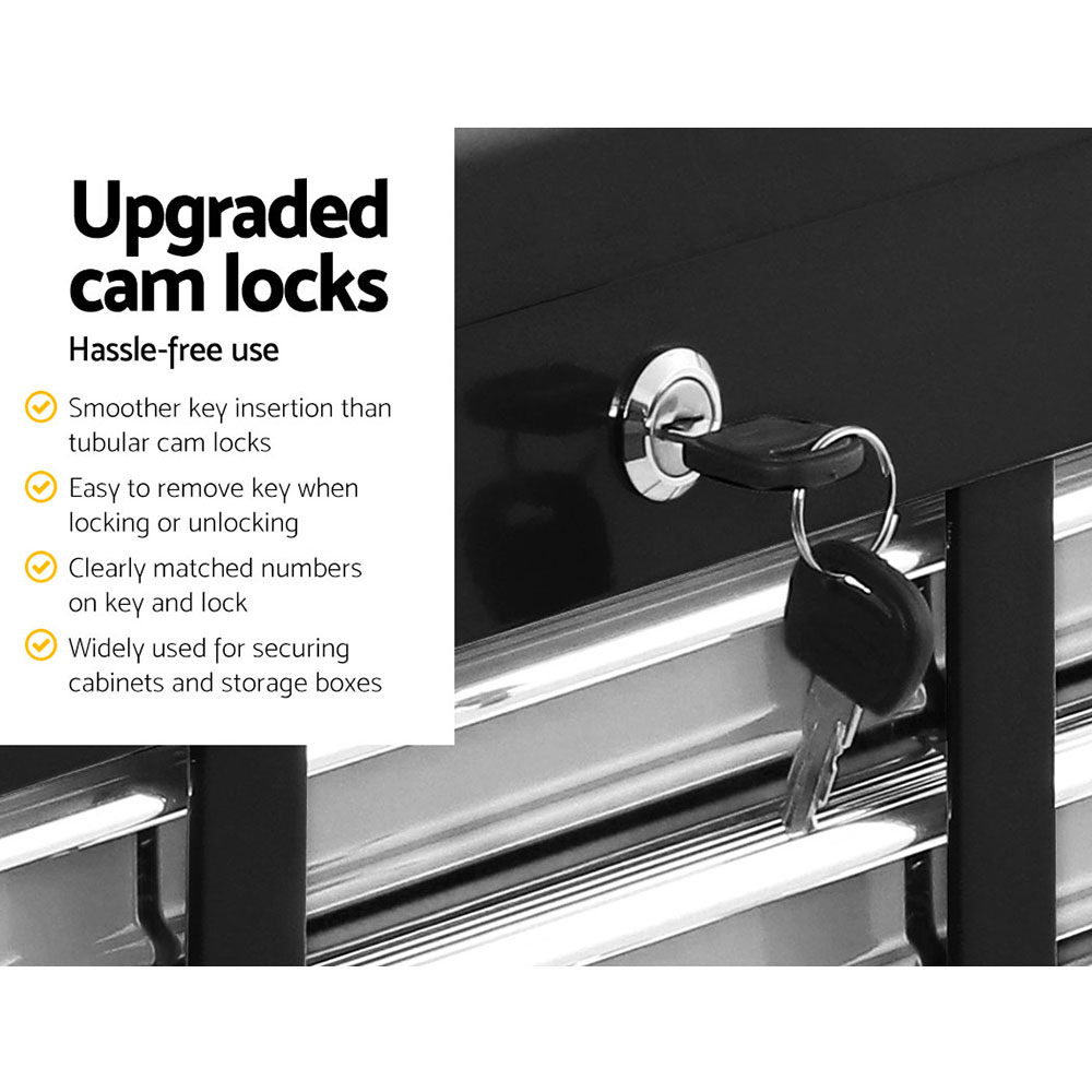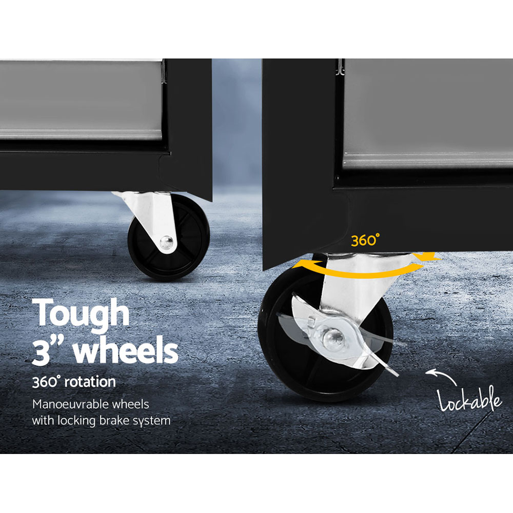 This robust, multi-drawer Giantz Tool Trolley is an essential for any workshop. Crafted from durable steel, it features smooth ball-bearing slides for easy access and a secure lock system for safety. Its spacious design includes varying drawer sizes to accommodate tools of all shapes, complete with non-slip liners. The chest is also mounted on omni-directional castors with locakble front wheels, ensuring a smooth maneuverability and stable positioning. Sleek and functional, it's perfect for organizing and protecting your valuable tools.
