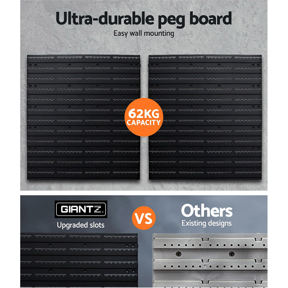 Are your tools always cluttering up your garage due to inadequate storage space? Well, now you can get more organised with our Giantz Tool Storage Rack. The rack is the perfect space-saving solution for storing your tools and accessories in your garage or storage room and makes it easier for you to find the rights tools when you need them. The two ultra-durable peg boards are simple to mount on the wall and feature an upgraded mounting slot design for extra stability in securing your tools. Then just insert the two shelves and fifty tool holders into the peg board slots for instant storage. The best part is that the tool holders are removable, so that you can easily change their layout on the peg board to accommodate future additions to your ever-growing tool collection.
