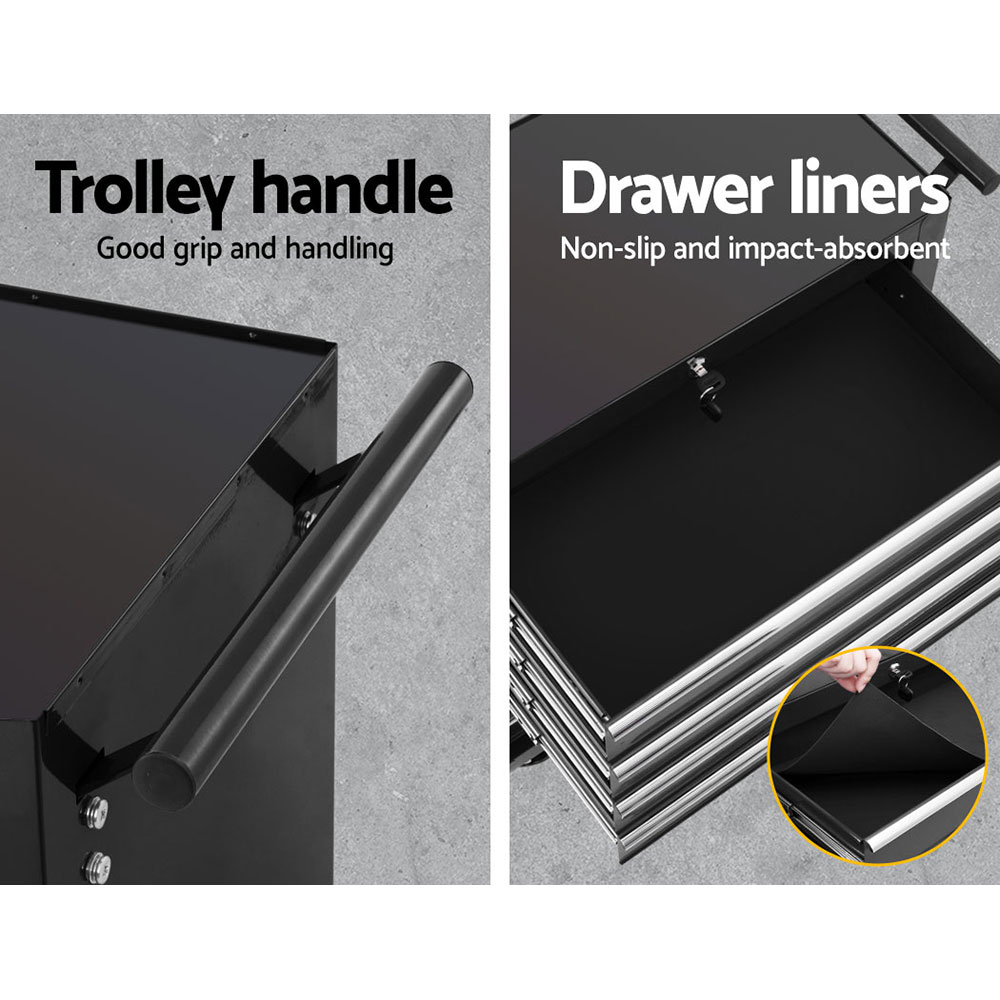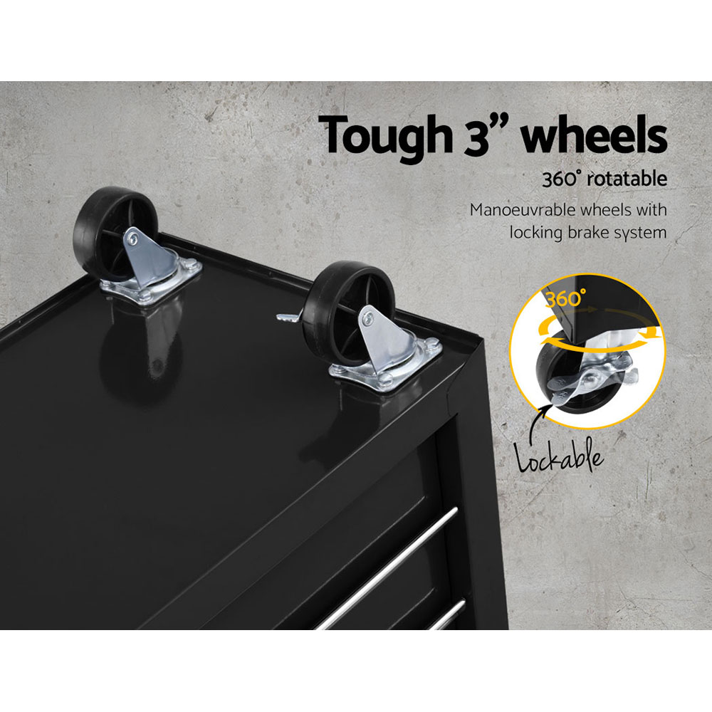 This robust, multi-drawer Giantz Tool Trolley is an essential for any workshop. Crafted from durable steel, it features smooth ball-bearing slides for easy access and a secure lock system for safety. Its spacious design accommodate tools of all shapes, complete with non-slip liners. The chest is also mounted on omni-directional castors with locakble front wheels, ensuring a smooth maneuverability and stable positioning. Sleek and functional, it's perfect for organizing and protecting your valuable tools.